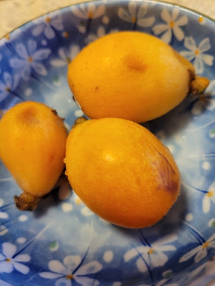 お客様からの頂き物、びわ、カレー、パン、もつ煮